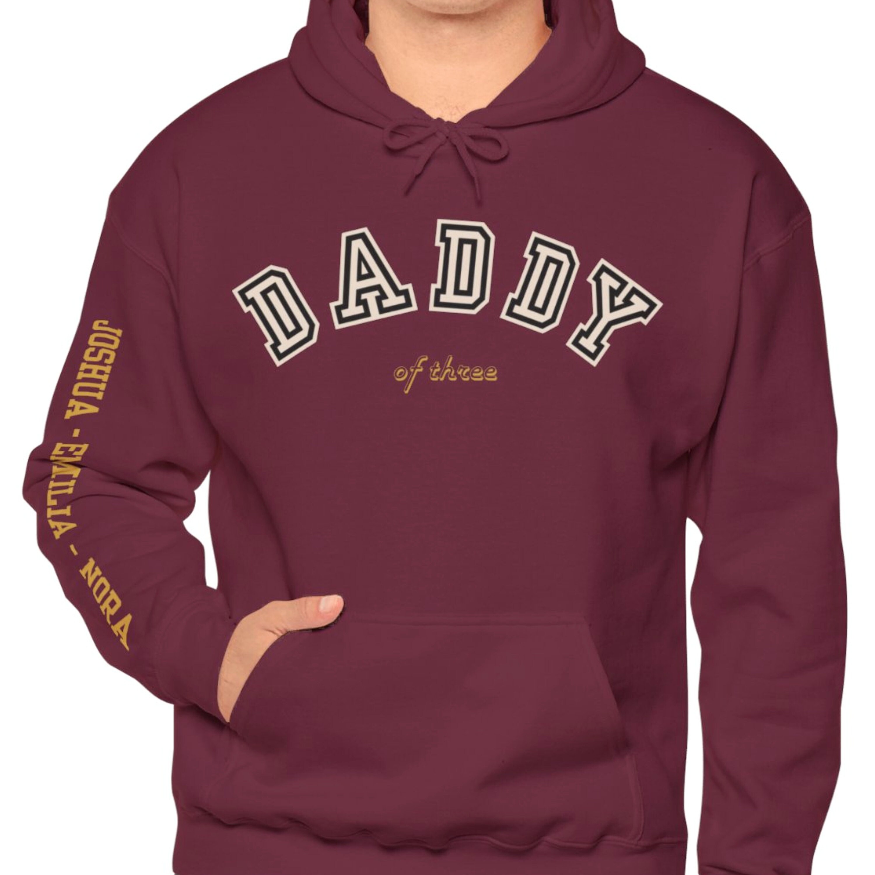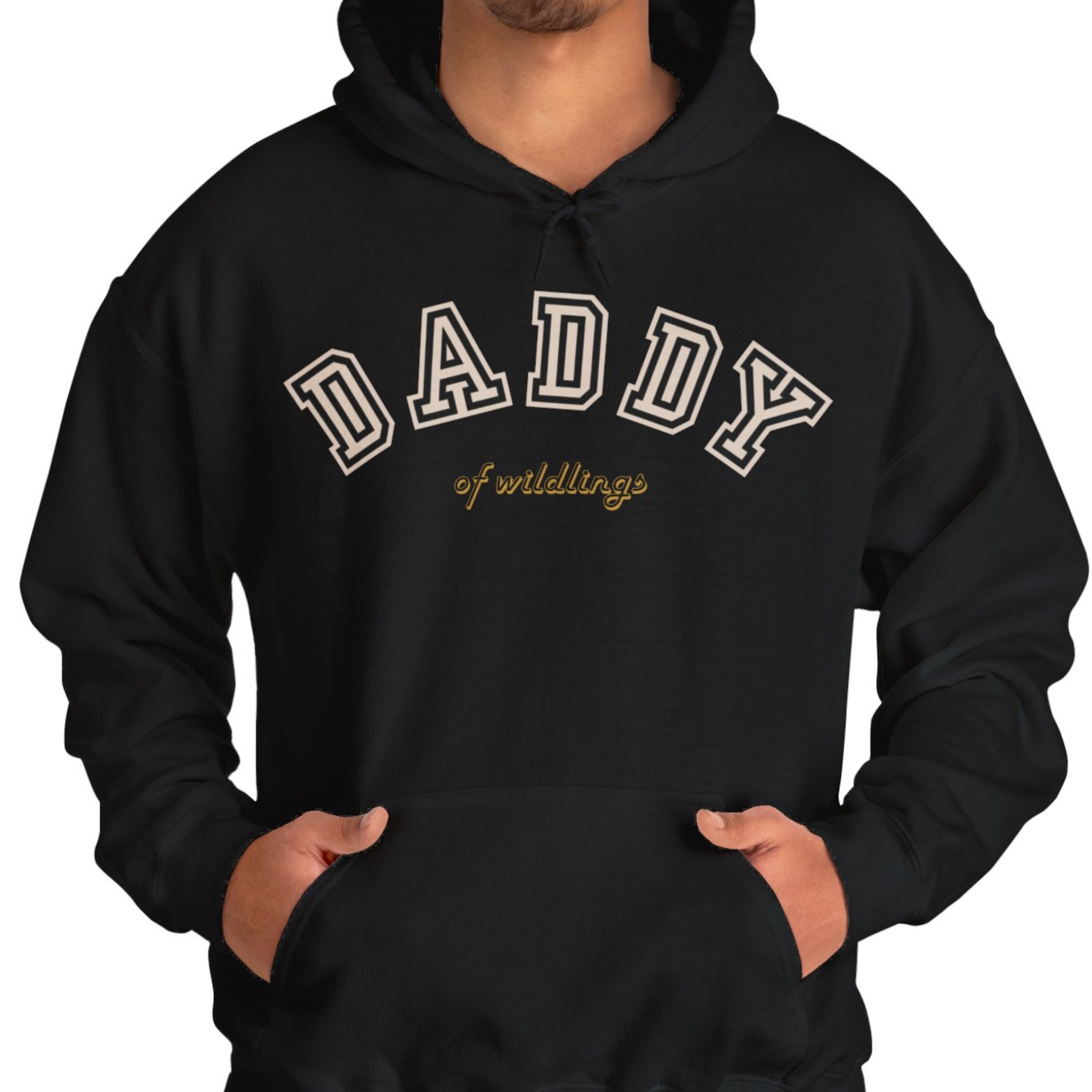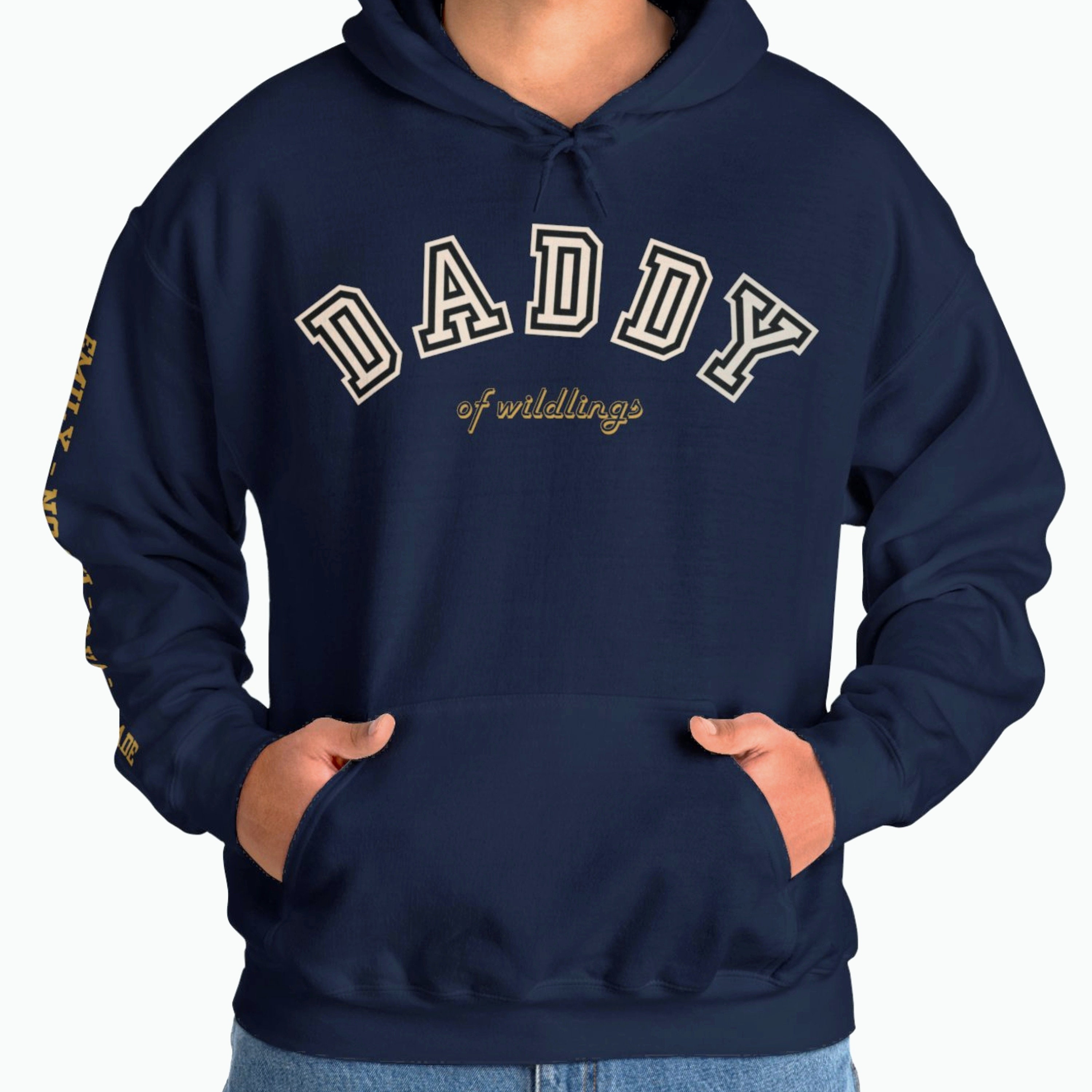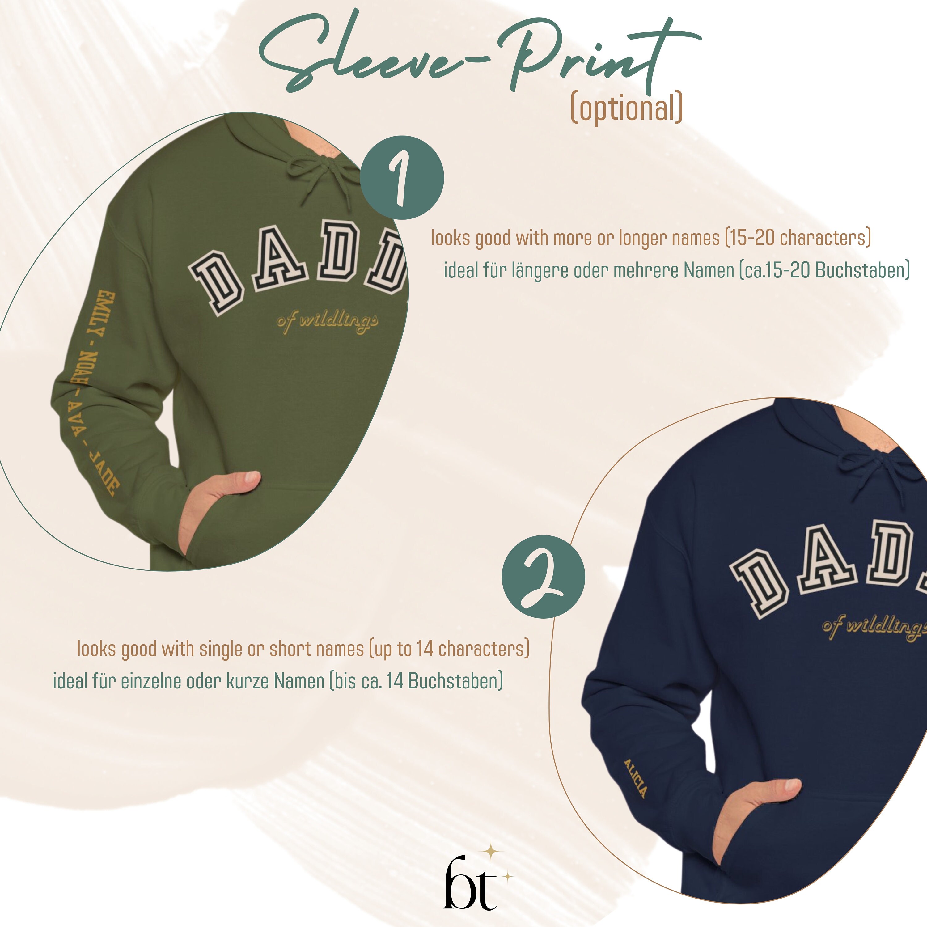 In addition to the striking letters "Daddy", the sweatshirt can be personalized with a sub-line of your choice. For example, a "Daddy of wildlings" becomes a "Daddy of twins" or "Daddy of three". If no personalization is specified, we automatically print the addition "of wildlings". If you wish, we can also print the sweater with your desired name on the sleeve. To do this, please simply select your desired color + sleeve print and enter the name(s) in the personalization field!