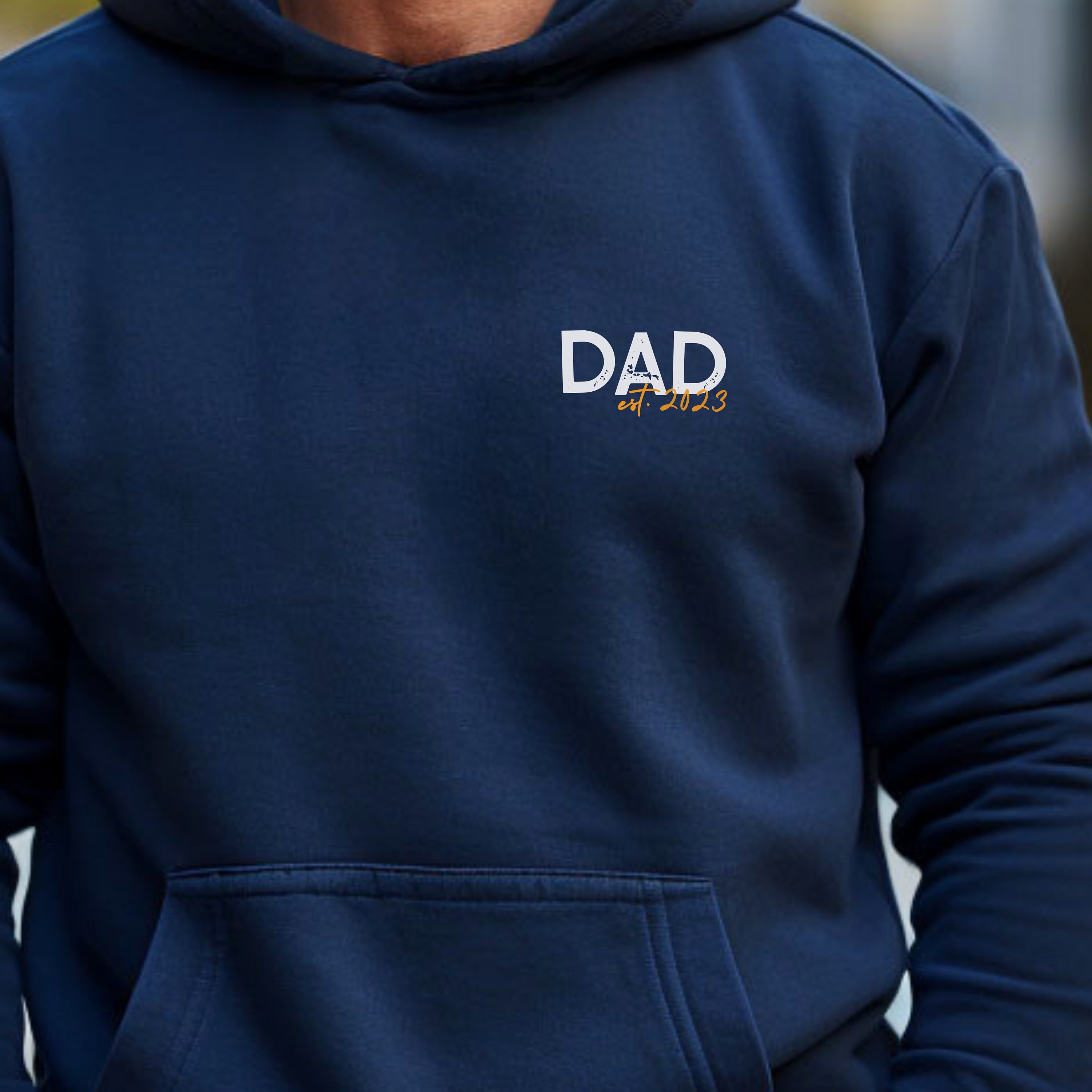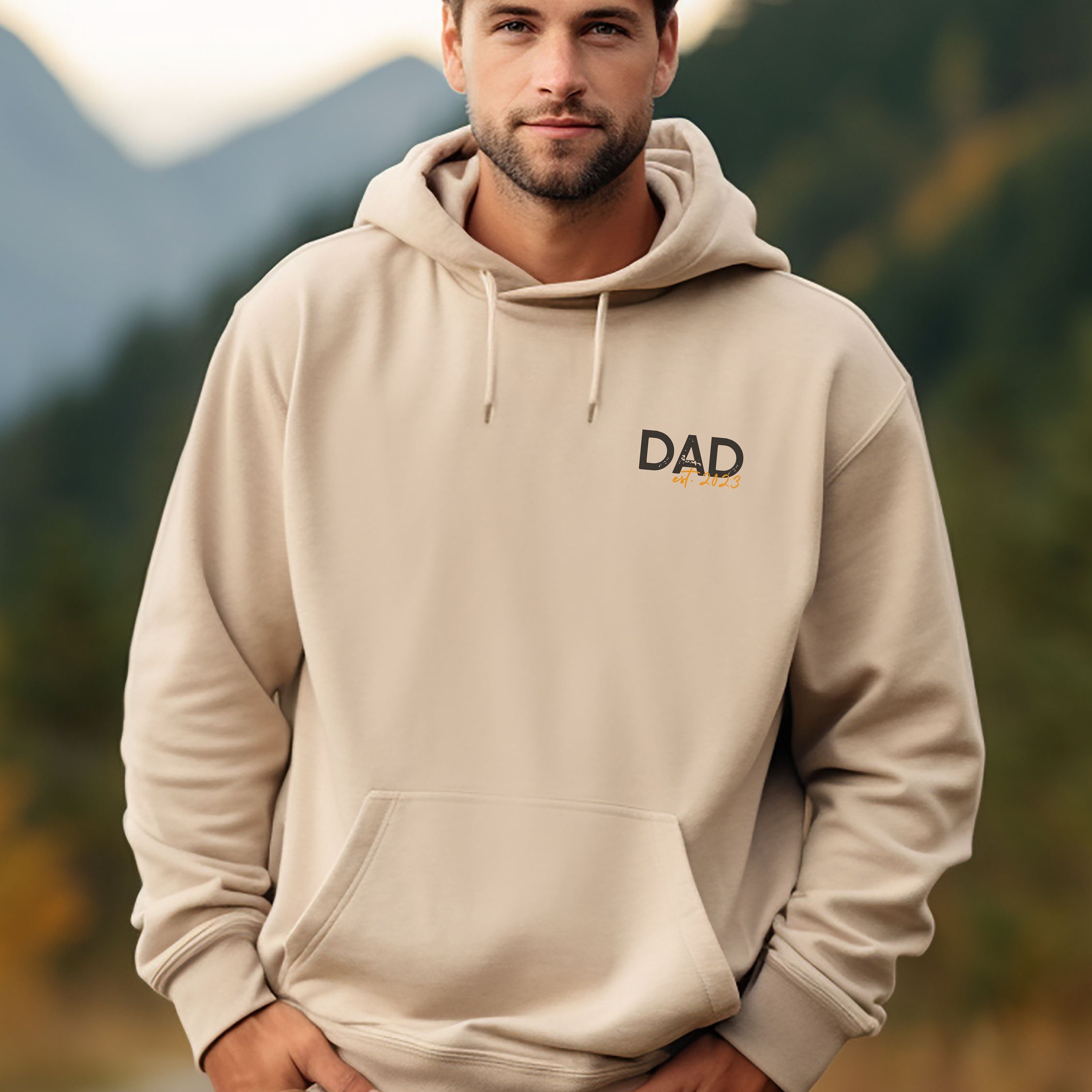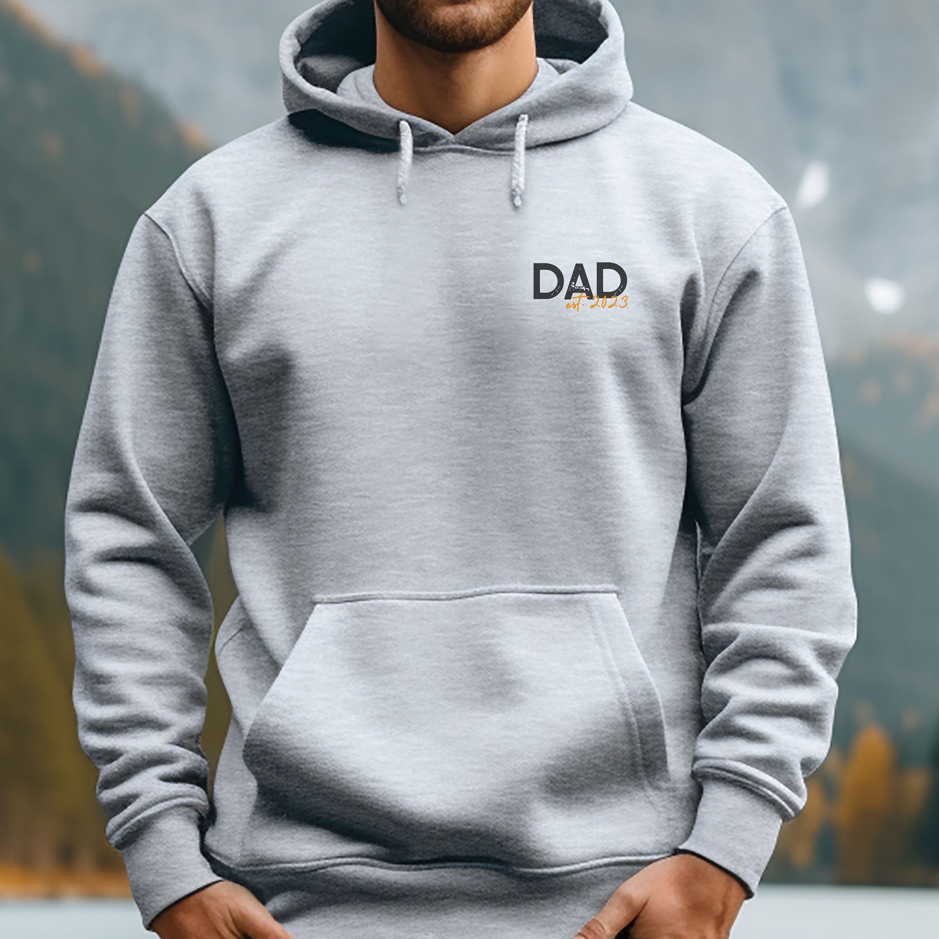 Comfortable dad hoodie made of medium-weight sweat fabric with a small "DAD" print and the birth year of your (first) child. Simple yet unique in design, it makes a perfect gift for Father's Day or a new baby.